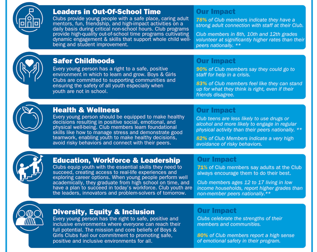 Boys & Girls Clubs are committed to helping ensure the safety of all youth especially when youth are not in school. Clubs provide a safe place, caring adult mentors, fun and friendship, and high-impact youth development programs on a daily basis during critical non-school hours.